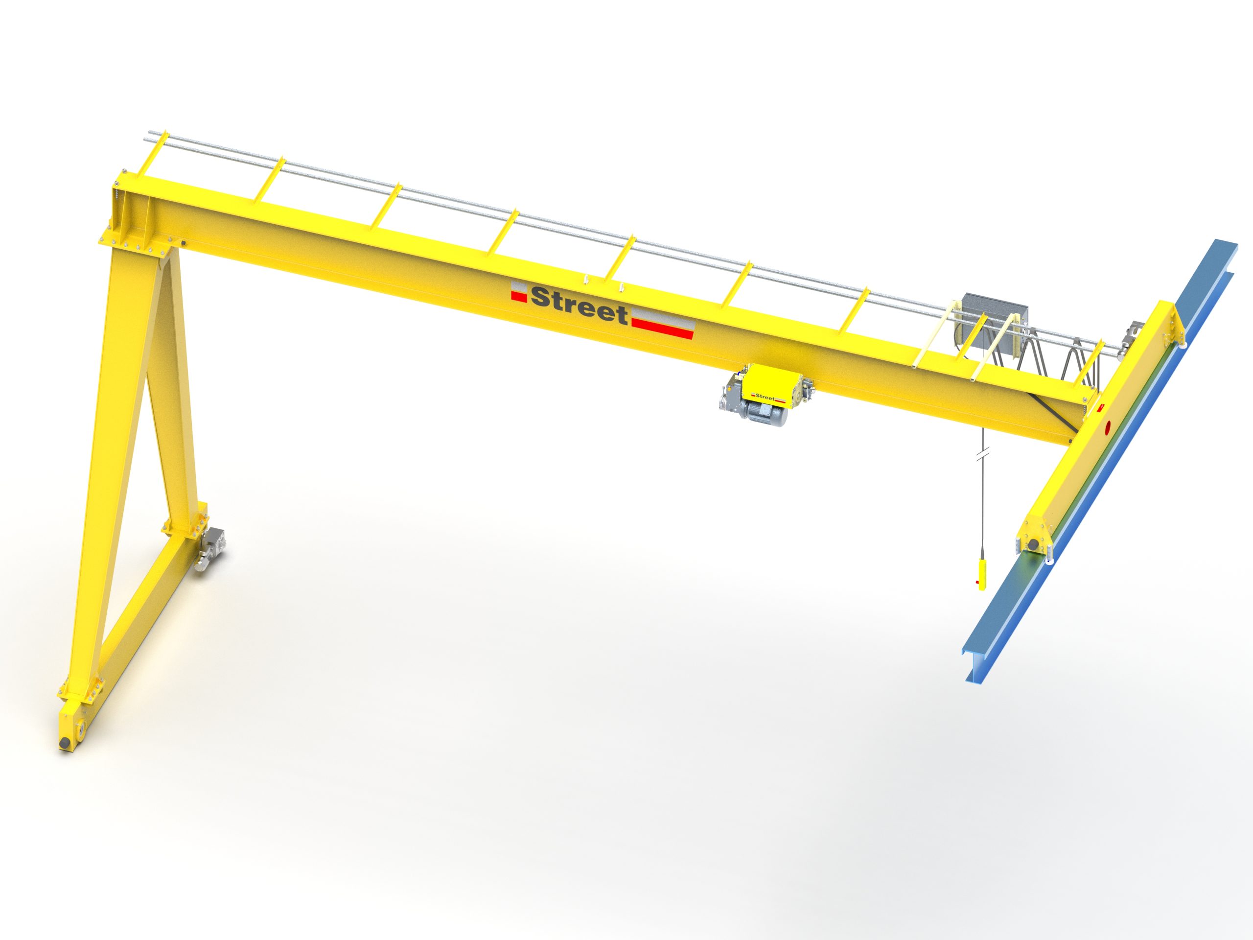 Street Semi-Portal cranes are a variation on the goliath crane concept and run on one floor rail and one high level rail mounted on columns or a building structure. Semi-Portal cranes are suitable for the applications described above for full portal cranes but they bring unique advantages in certain applications. In particular they bring specific benefits where they are specified to run beneath overhead cranes in production facilities to give localised hook service to production cells down one side of a bay and the overhead crane provides general hook service of the whole bay. They may also operate under a gantry crane cantilever as shown in the adjacent application picture.