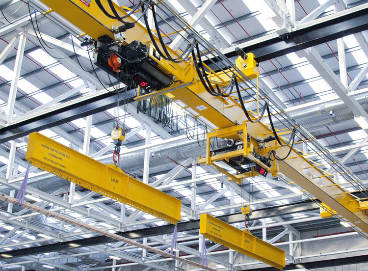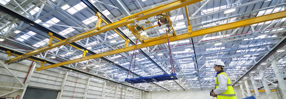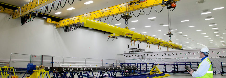 Forming part of the roof structure, the cranes can operate within the confined space and height restriction of the bay, ensuring the production area is unobstructed.